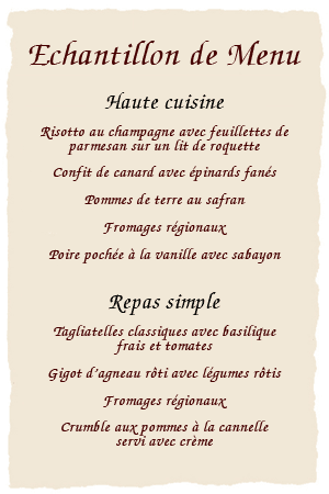 Bien que nous puissions garantir que tous les mets qui vous seront servis seront de la plus haute qualité, nous sommes fiers de pouvoir offrir un choix de menus si tout le chalet est occupé, c’est-à-dire un minimum de 8 personnes. Vous pouvez choisir parmi des menus « haute cuisine » ou « repas simple ». Nous nous efforcerons de satisfaire les régimes particuliers.